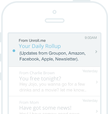 Learn moreAs a means of keeping our service free, Slice Technologies, which owns Unroll.Me, measures e-commerce through a technology that automatically recognizes commercial emails and extracts purchase information from them. Our technology is designed to ignore personal email, which does not help us measure market trends.