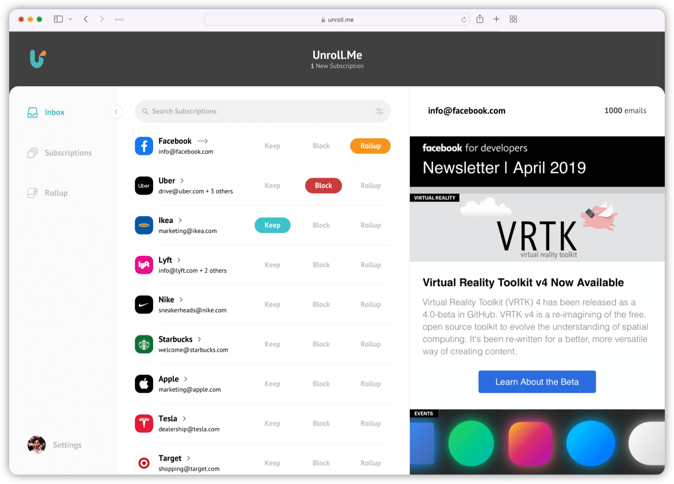 Decluttering your inbox has never been so easy, or looked so good. With the new Unroll.Me, you can block unwanted emails, keep the ones you want, and rollup the rest into a single daily digest.